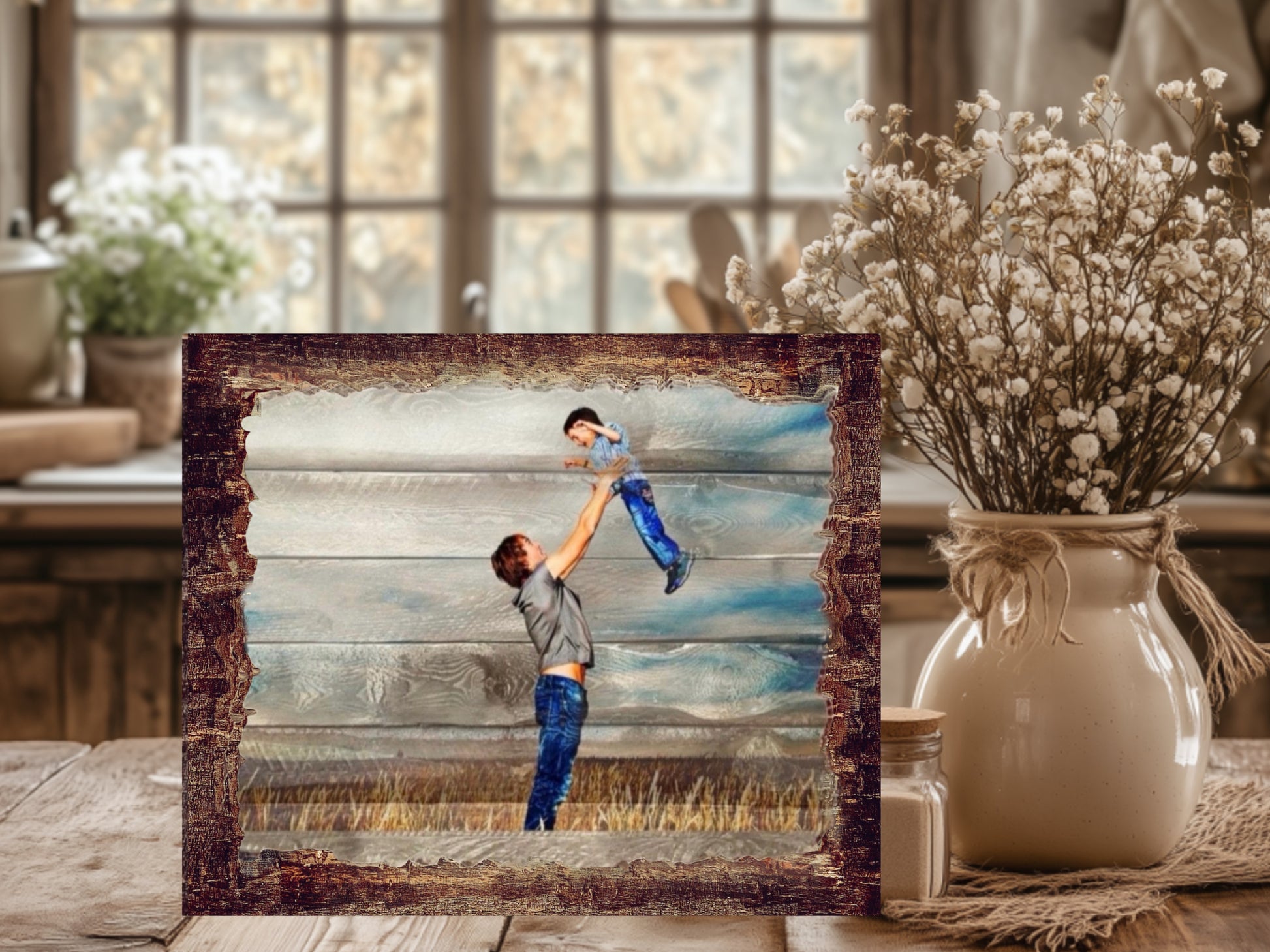 Your everyday photo is artistically blended with unique RUSTIC BACKGROUND artwork and transferred to a richly stained wood board measuring 5x7 or 8x10 inches. Alternatively, your NATURAL PHOTO can be directly transferred to a wood board without rustic effect. Edges for either style are completed with a hand distressed finish. Wood artwork comes complete with a metal sawtooth hanger on the back for easy wall display.